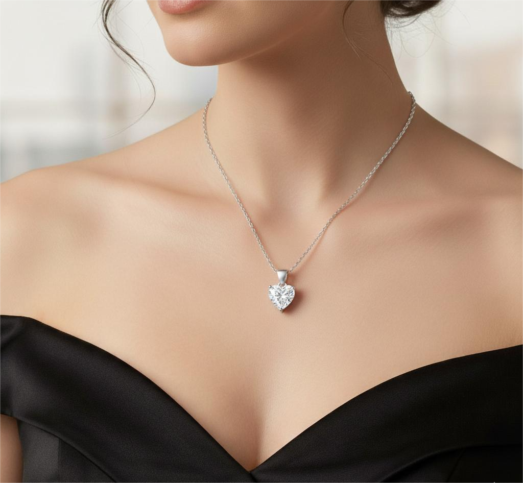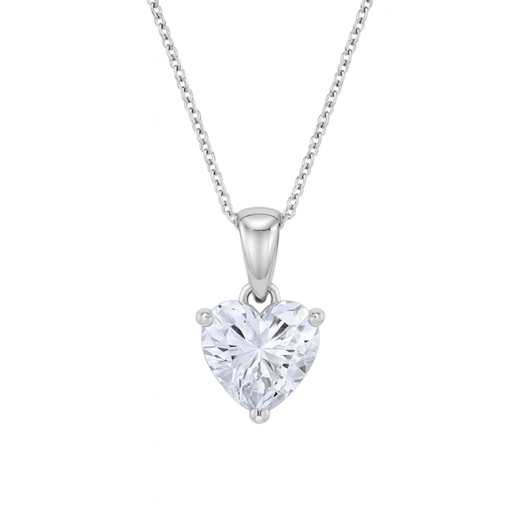 Heart-shaped silver pendant featuring a central solitaire gem, designed with a smooth, polished finish to enhance its radiant sparkle and classic charm.