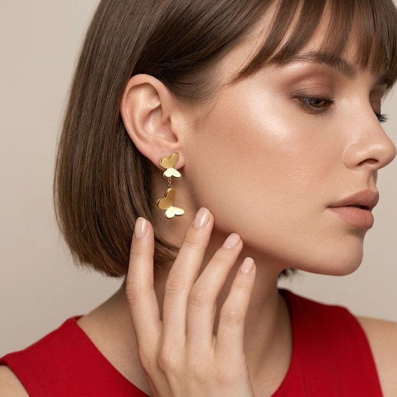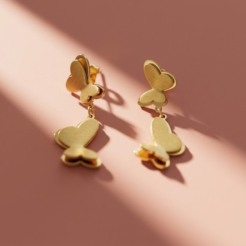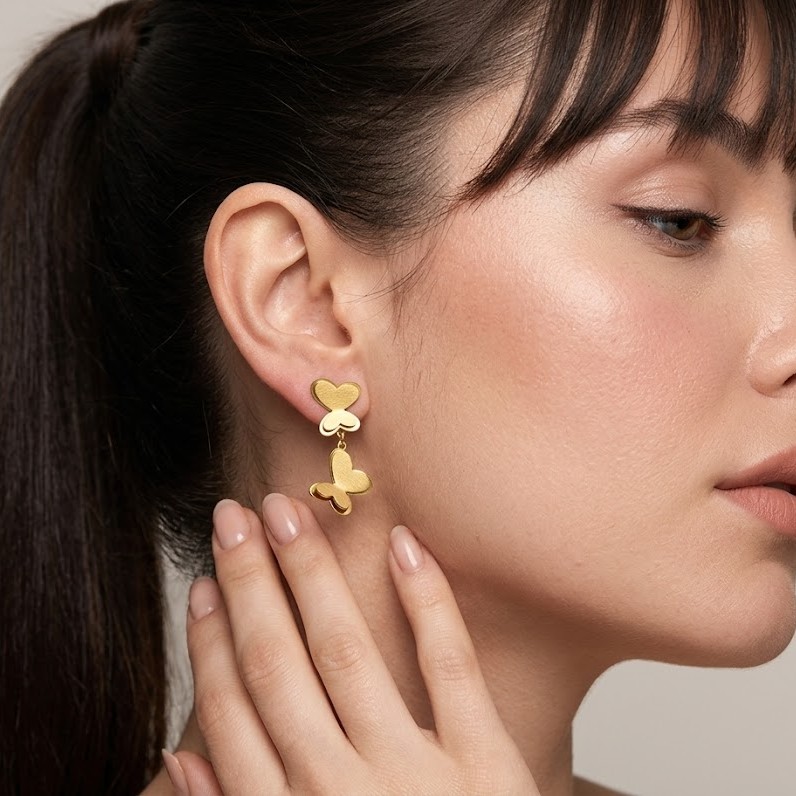 Playful and elegant, these Butterfly Drop Earrings for Women feature a delicate butterfly motif with a sleek gold finish. These butterfly design drop earrings for women in gold tone bring a soft feminine charm to everyday jewellery styling. Designed in demi-fine jewellery quality, these butterfly gold drop earrings for women are anti-tarnish and waterproof.