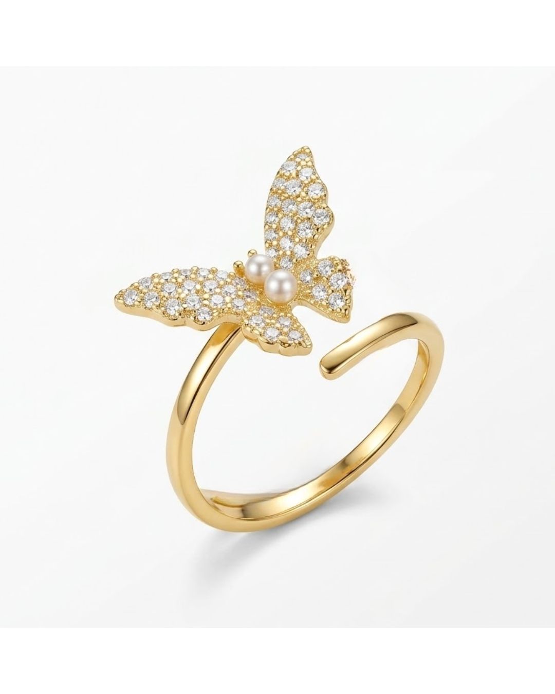 Embrace elegance and whimsy with the Butterfly Pearl Clasp Ring from Risha Jewels. This exquisite ring features a delicate butterfly design paired with a classic pearl clasp, all crafted from premium brass. The adjustable fit guarantees comfort and adaptability, making it an ideal accessory for any occasion.