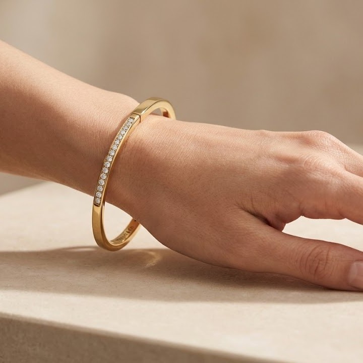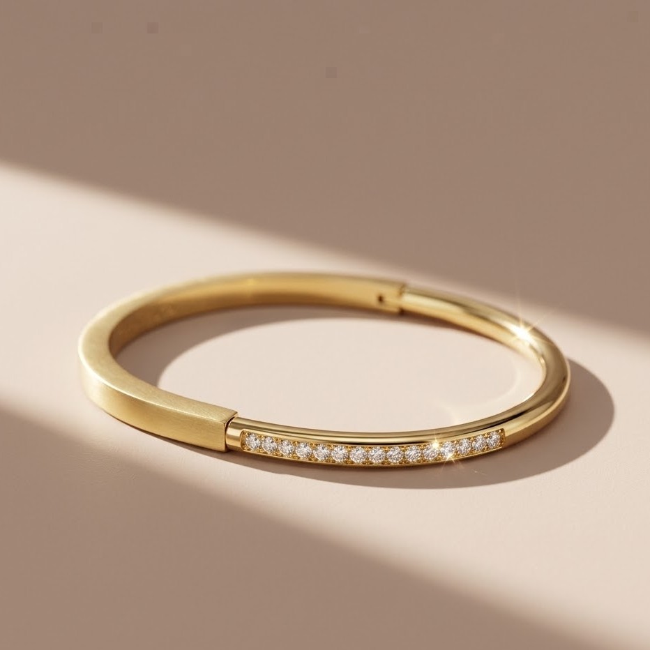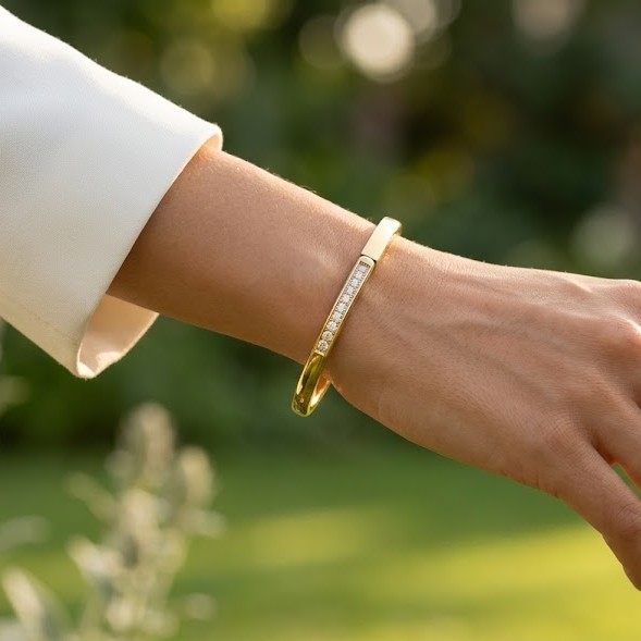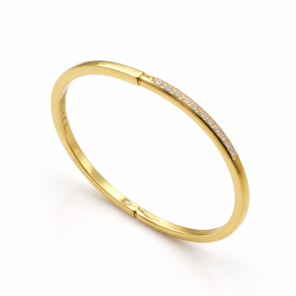 Add a touch of sparkle with this Crystal Diamond Gold Bangle Bracelet for Women. Designed with shimmering crystal stones and a sleek gold finish, this elegant gold bangle bracelet brings timeless charm to your jewellery collection. Its refined design makes it perfect for everyday wear, parties, and festive occasions.