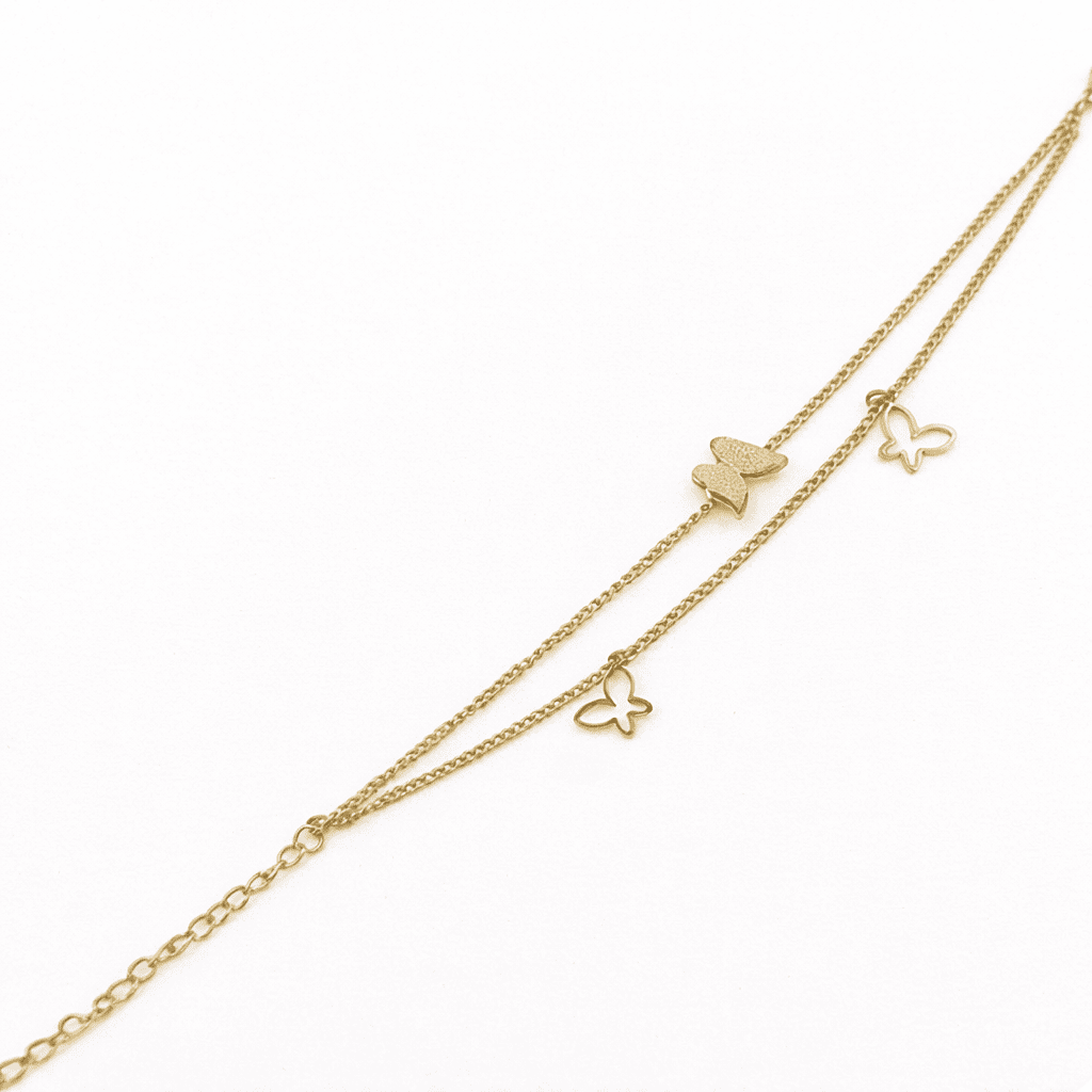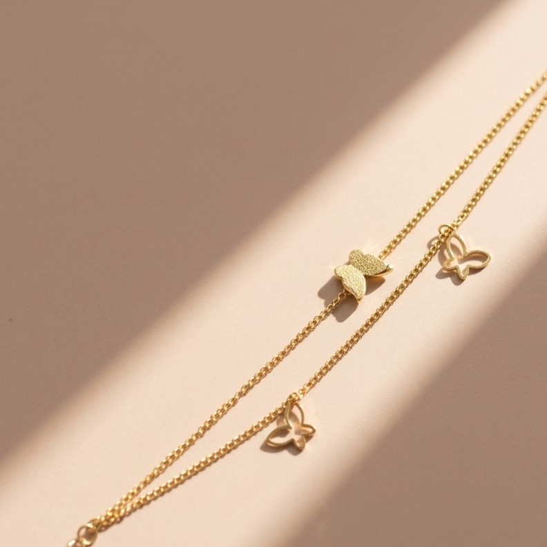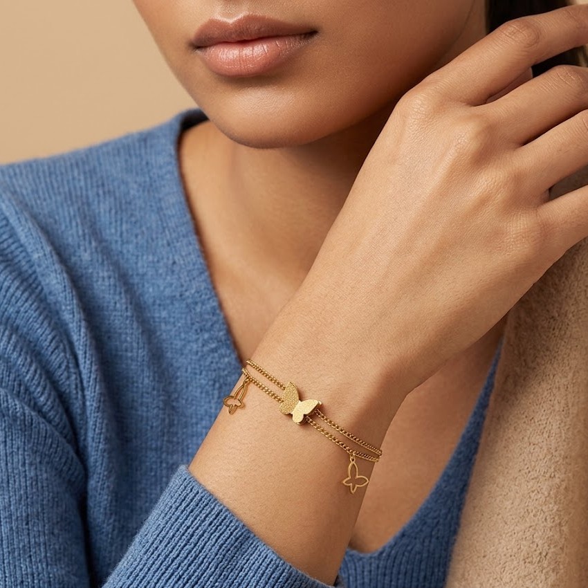 Delicate and feminine, this Golden Butterfly Layered Bracelet for Women features layered chains with a charming butterfly motif. This butterfly layered gold bracelet for women with dainty chain design adds a playful yet elegant touch to everyday jewellery styling. Crafted in demi-fine jewellery quality, this butterfly charm bracelet for women is anti-tarnish and waterproof.