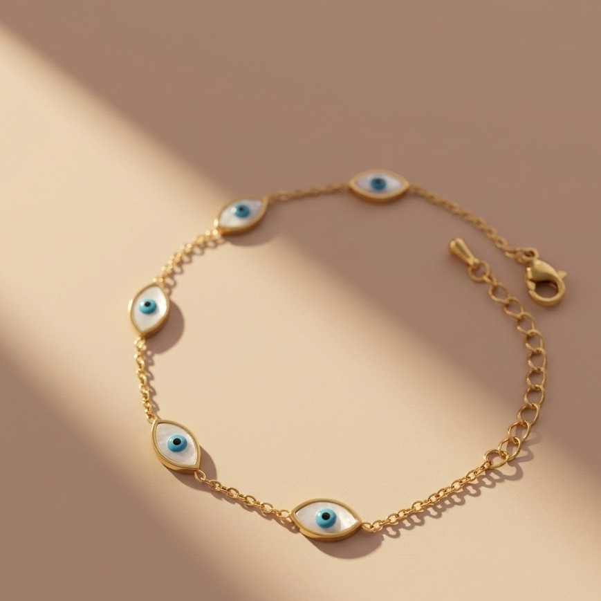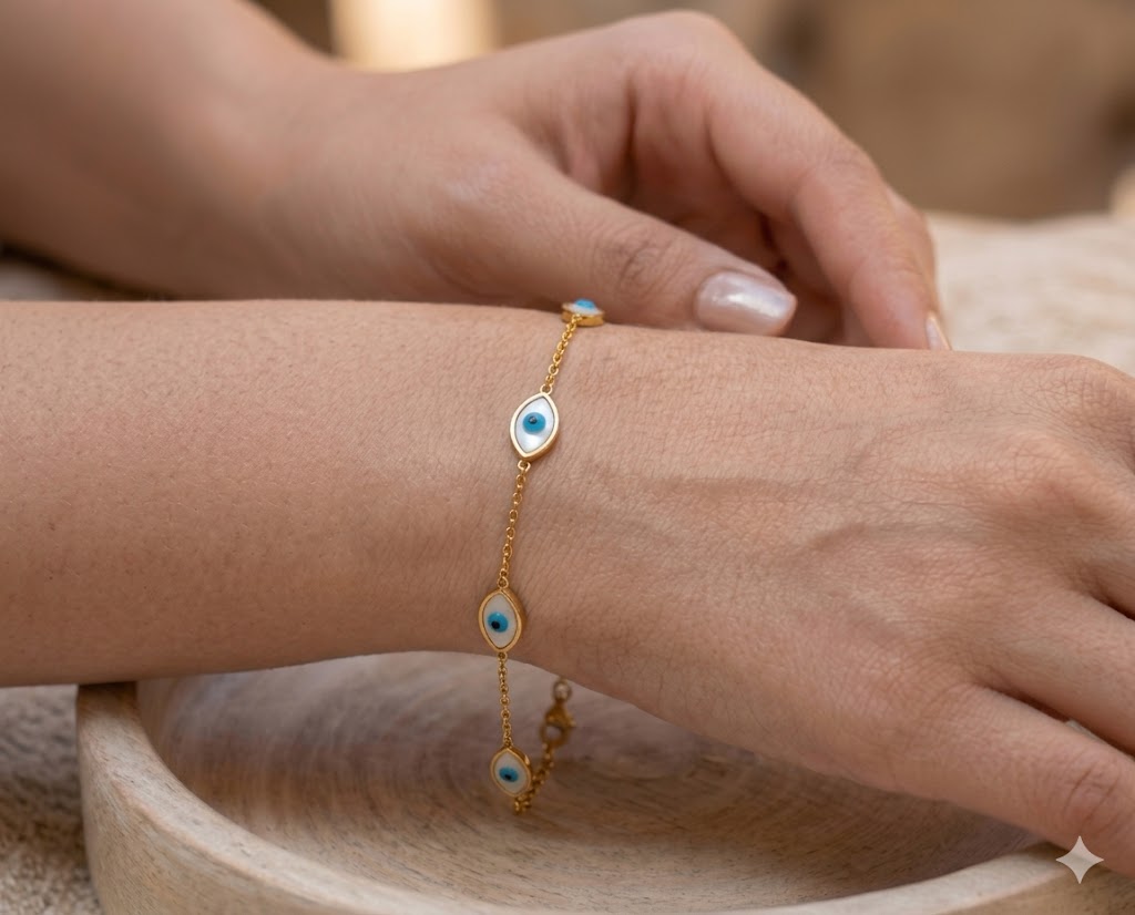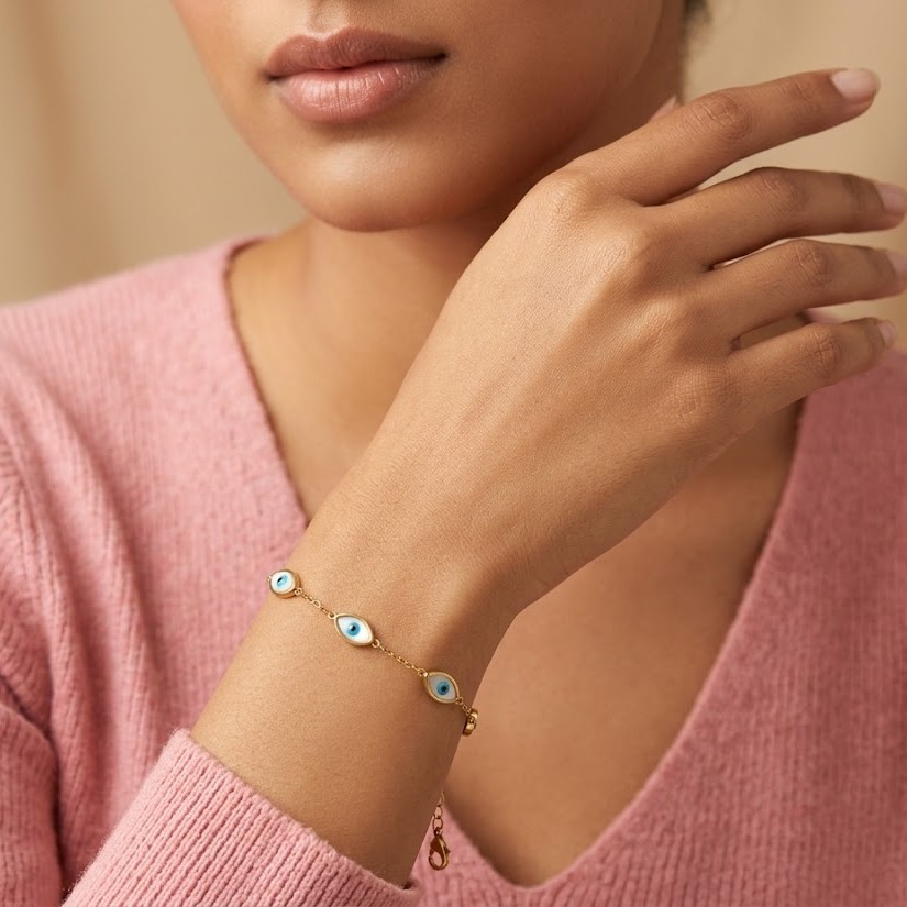 Protective and stylish, this Golden Evil Eye Charm Bracelet for Women features a symbolic evil eye charm with a sleek gold chain. This evil eye gold charm bracelet for women with blue stone design adds both meaning and style to everyday jewellery. Crafted in demi-fine jewellery quality, this evil eye protection bracelet for women is anti-tarnish and waterproof.