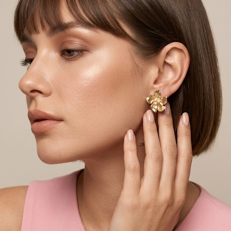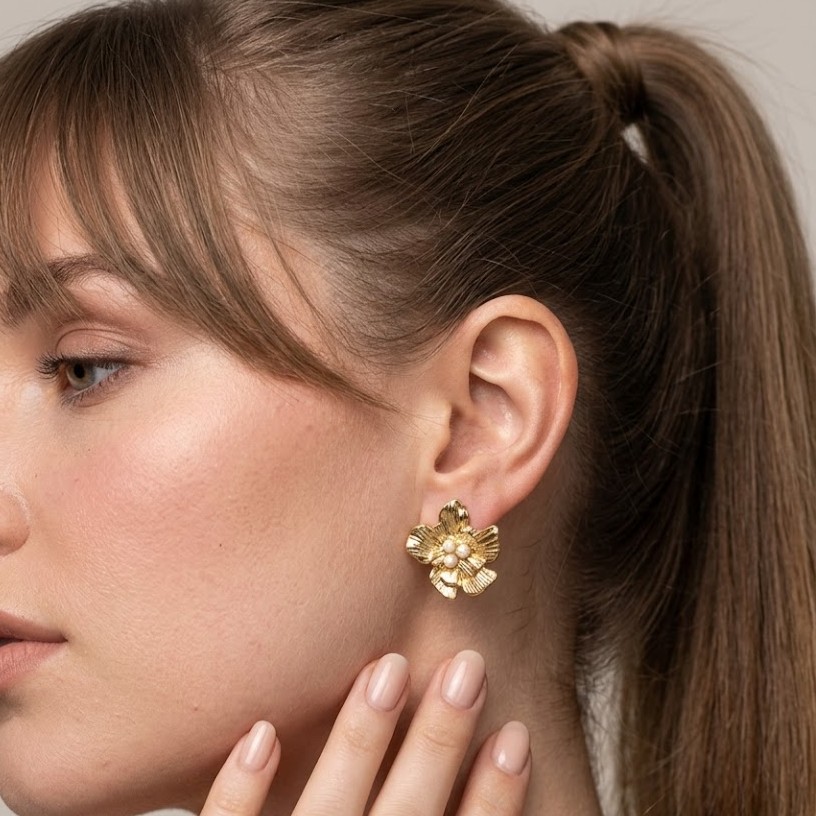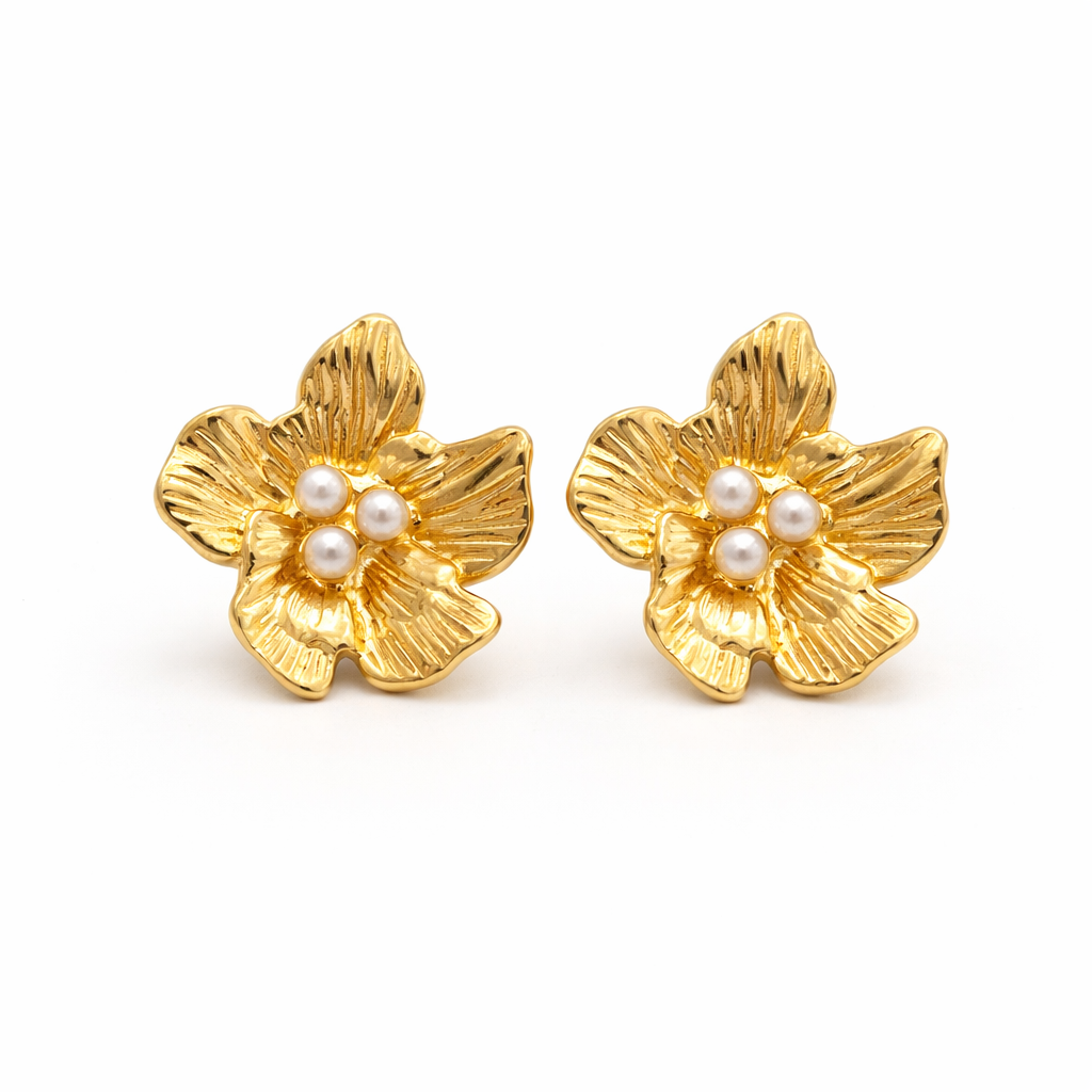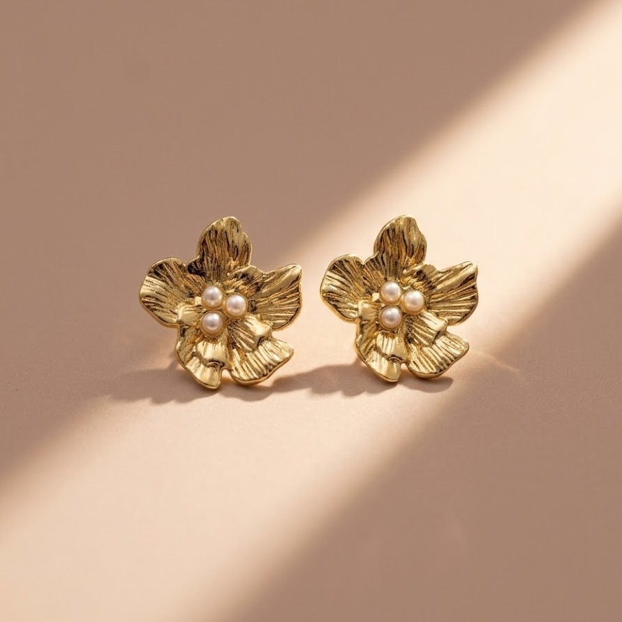 Delicate and feminine, these Golden Pearl Flower Stud Earrings for Women feature a beautiful floral design with a classic pearl center. These gold flower stud earrings with pearl for women bring timeless elegance to everyday and festive outfits. Crafted to last, these pearl floral stud earrings for women are anti-tarnish and waterproof for effortless everyday wear.