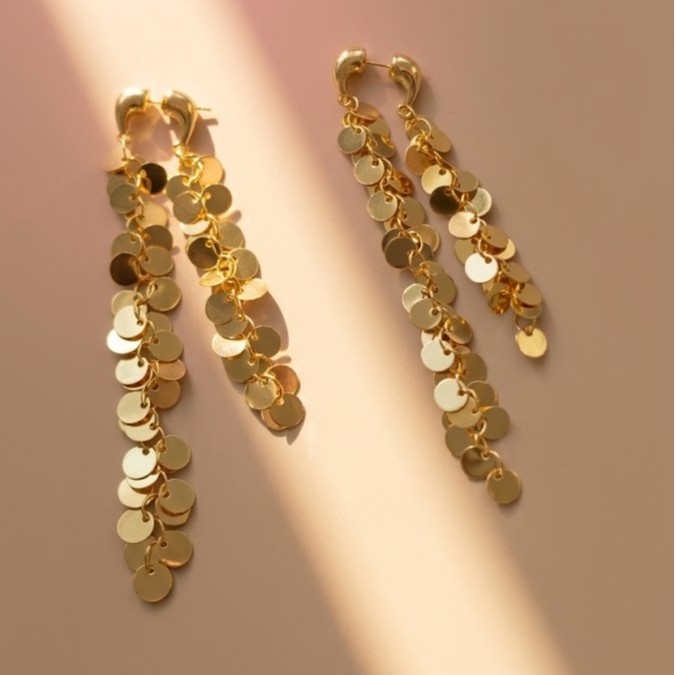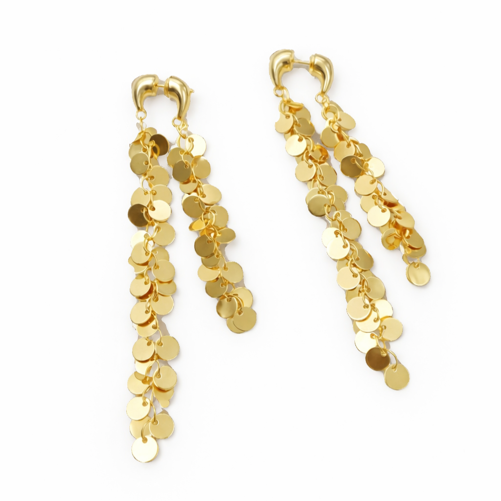 Bold and glamorous, these Golden Sequin Tassel Earrings for Women feature cascading tassel chains with shimmering sequin details. These gold tassel statement earrings for women with sequin design create a striking look perfect for parties and special occasions. Crafted in demi-fine jewellery quality, these long gold tassel drop earrings for women are anti-tarnish and waterproof.