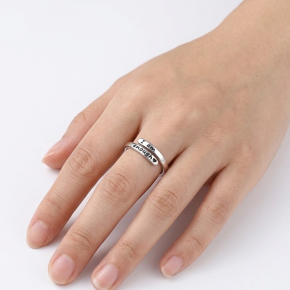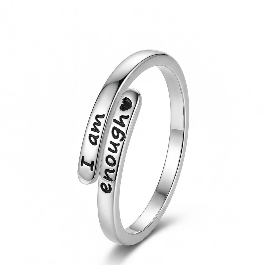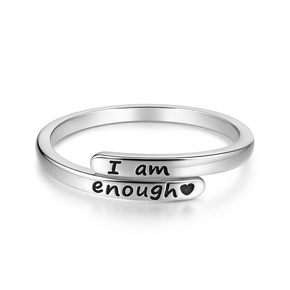 The I Am Enough Silver Ring is a beautiful piece of jewelry that carries a powerful message. Made from high-quality 925 sterling silver, this ring is designed to remind you of your self-worth every day. The ring has a modern front-open design, making it adjustable and comfortable to wear.