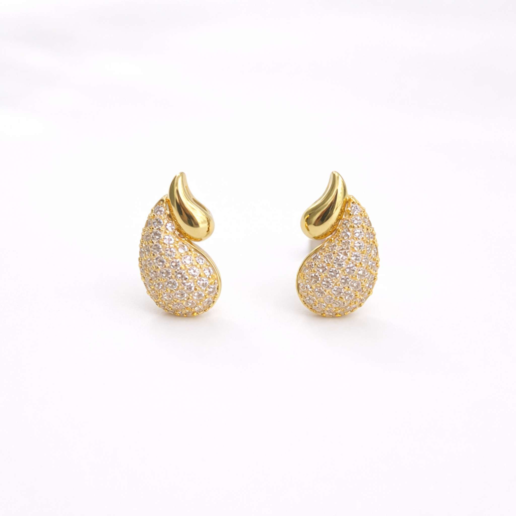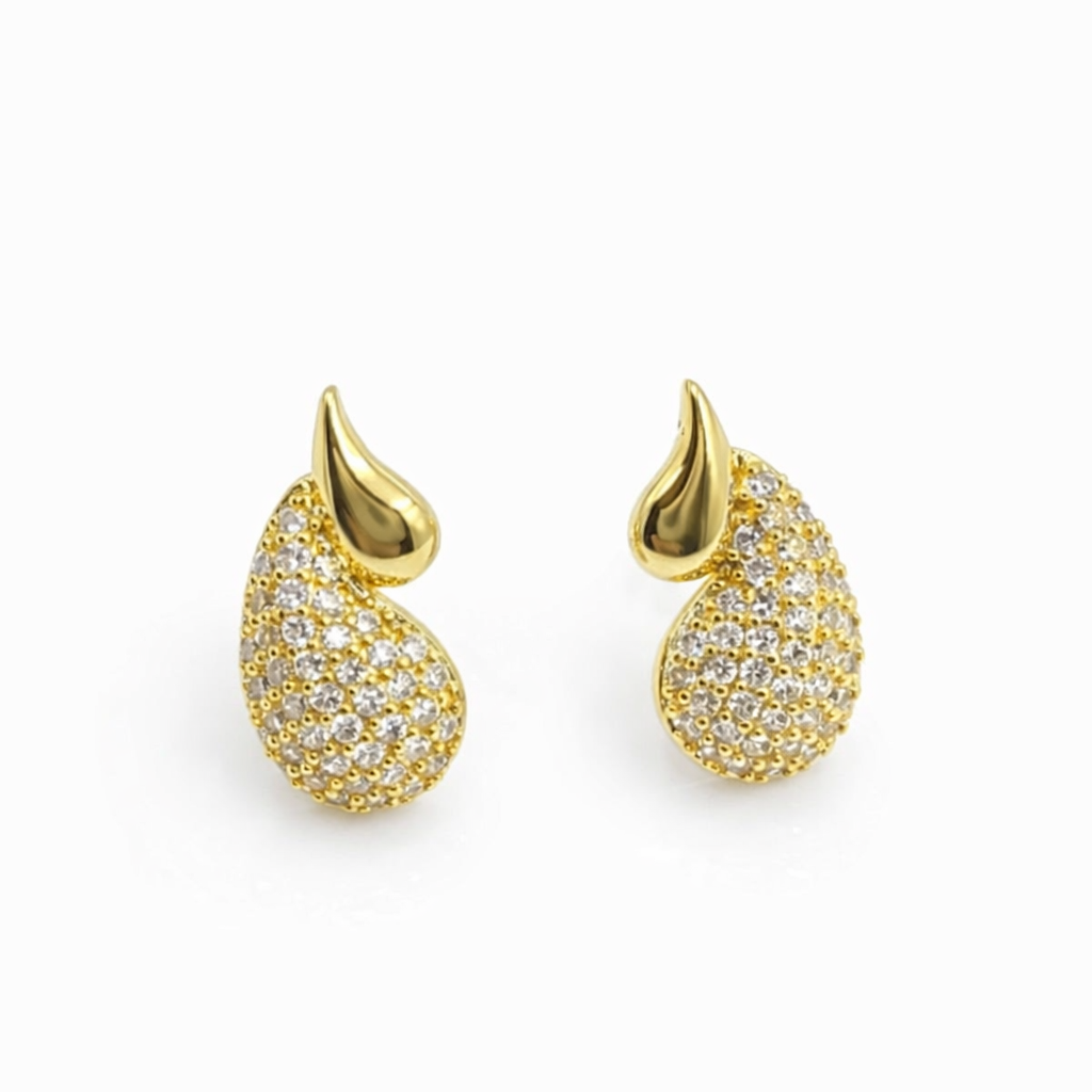 Inspired by traditional design, these Paisley Sparkle Stud Earrings for Women feature a paisley motif with shimmering stones. These paisley stud earrings with cubic zirconia for women add a subtle sparkle to both ethnic and modern outfits. Crafted in demi-fine jewellery quality, these gold paisley stud earrings for women are anti-tarnish and waterproof.
