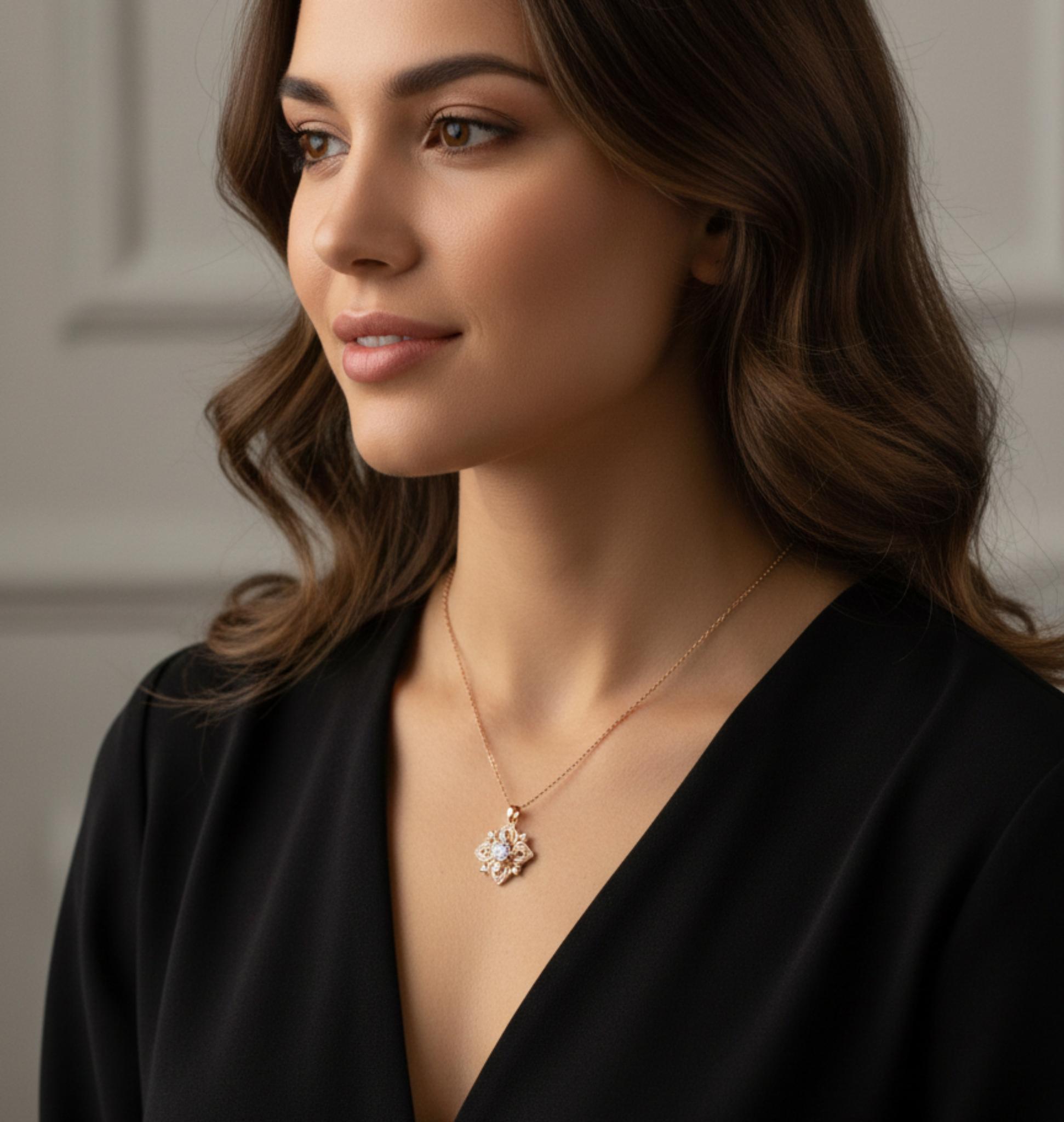 – Elegant Evenings: Pair your Rose Gold Floral Sparkle Pendant with a flowing evening gown to add a graceful, sparkling touch to your formal attire.