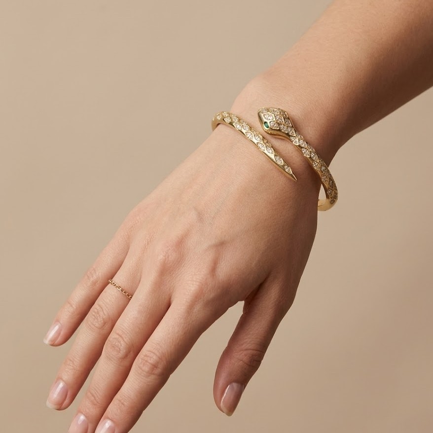 Style this serpentine spark bracelet with casual outfits, dresses, or evening wear to add a subtle shine and modern elegance to your look.