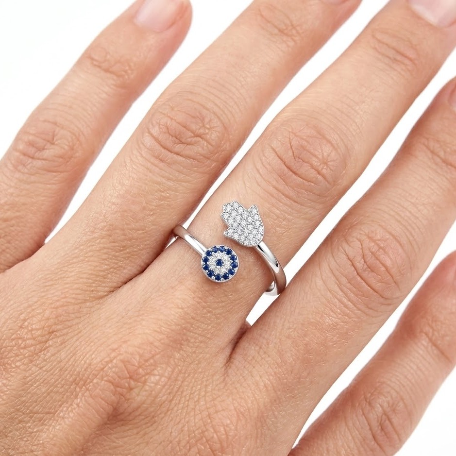 At Risha Jewels, we take pride in offering jewelry that combines beauty with deep cultural significance. The Silver Evil Eye Amulet Ring is a prime example of this balance. Crafted with precision, this ring features the Hamsa Hand and Evil Eye symbols, known for their protective qualities. Here’s why this ring is a must-have: