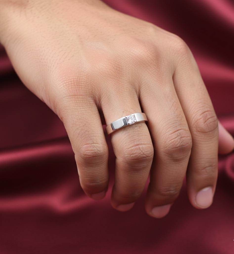 Elevate your style with the Silver Men Collection Ring Studded with Single CZ Stone. This ring, crafted from premium 925 silver, embodies a perfect mix of sophistication and contemporary design. The AAA+ cubic zirconia stone adds a touch of elegance, making it ideal for any occasion.