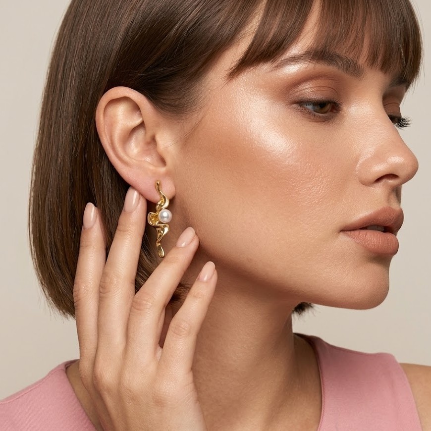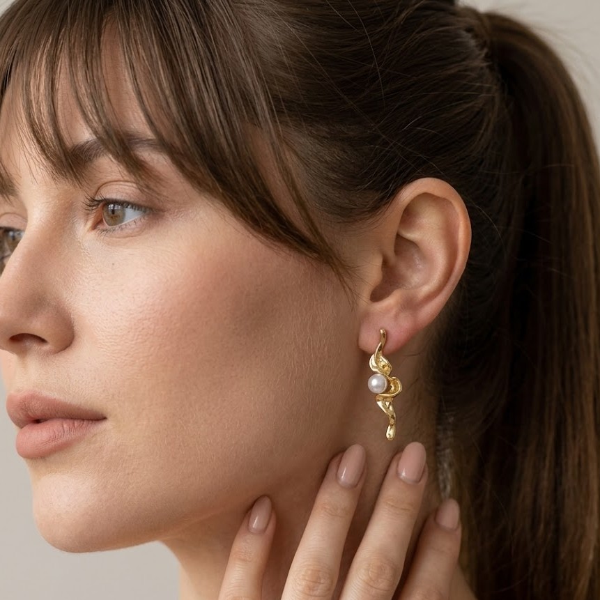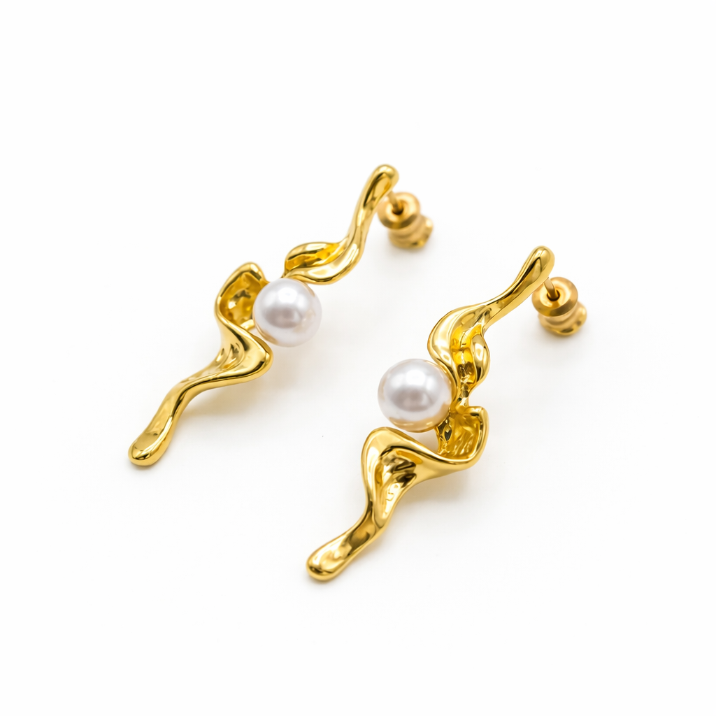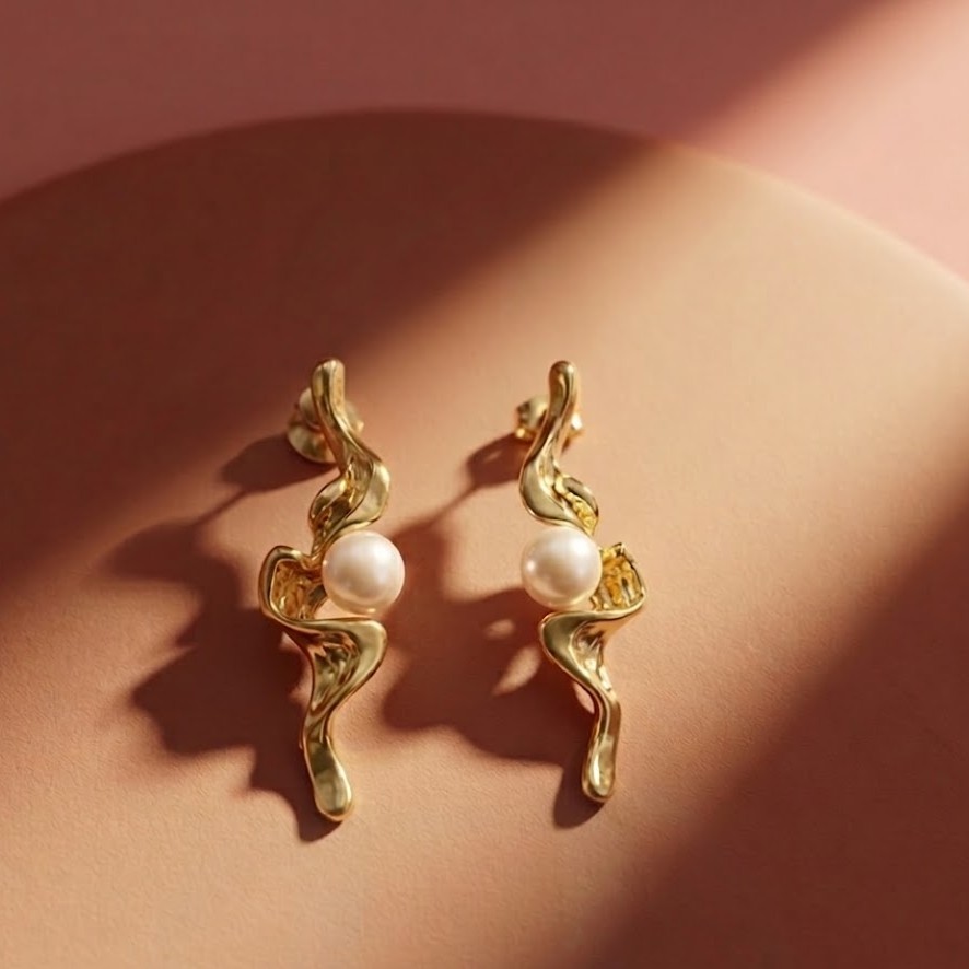 Elegant and bold, these Twisted Gold Pearl Statement Earrings for Women feature a beautiful twisted gold design paired with classic pearls. These gold pearl statement earrings for women with twisted design add a luxurious touch to party and festive outfits. Crafted in demi-fine jewellery quality, these pearl drop statement earrings for women are anti-tarnish and waterproof.