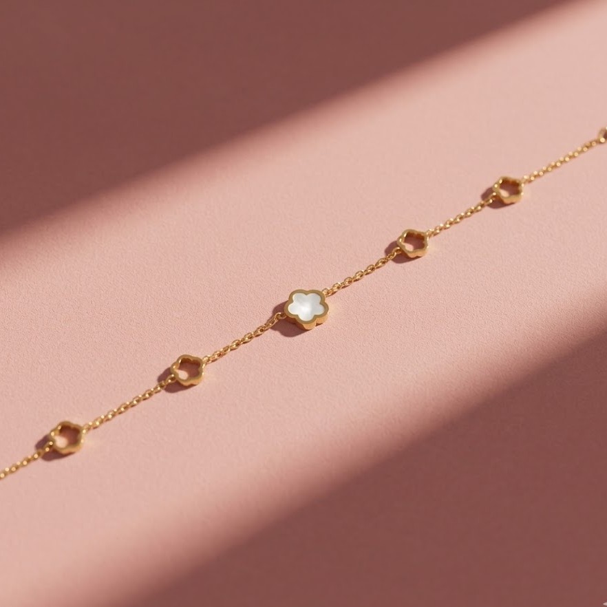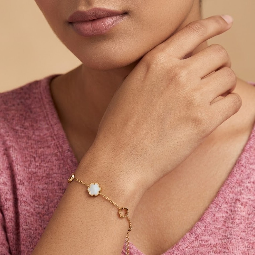 Elegant and symbolic, this White Clover Charm Bracelet for Women features a delicate clover charm with a sleek gold chain. This white clover gold charm bracelet for women with minimal design adds a sophisticated and lucky charm to your jewellery collection. Crafted in demi-fine jewellery quality, this clover bracelet for women is anti-tarnish and waterproof.